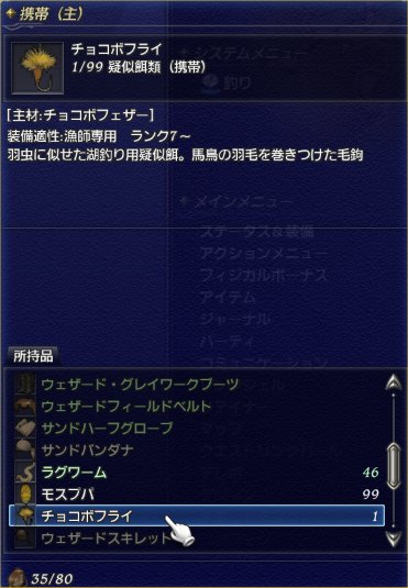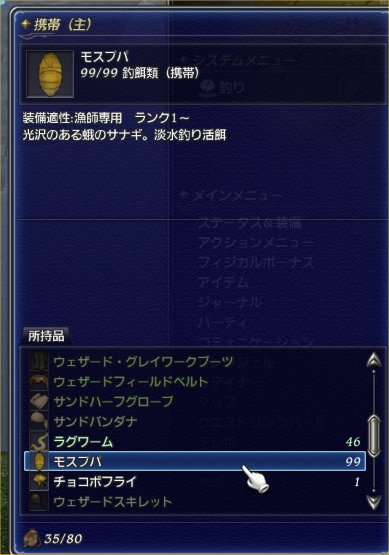 釣竿とエサは装備をひらくとでてきます。